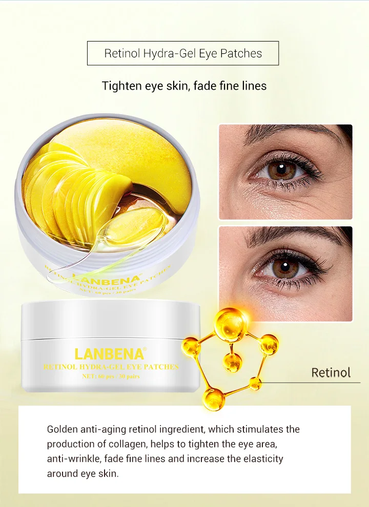 Golden anti-aging retinol ingredient, which stimulates the production of collagen, helps to tighten the eye area, anti-wrinkle, fade fine lines and increase the elasticity around eye skin.
