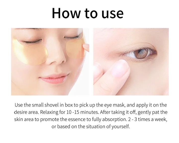 Use the small shovel in box to pick up the eye mask, and apply it on the desire area. Relaxing for 10 -15 minutes. After taking it off, gently pat the skin area to promote the essence to fully absorption. 2 – 3 times a week, or based on the situation of yourself.